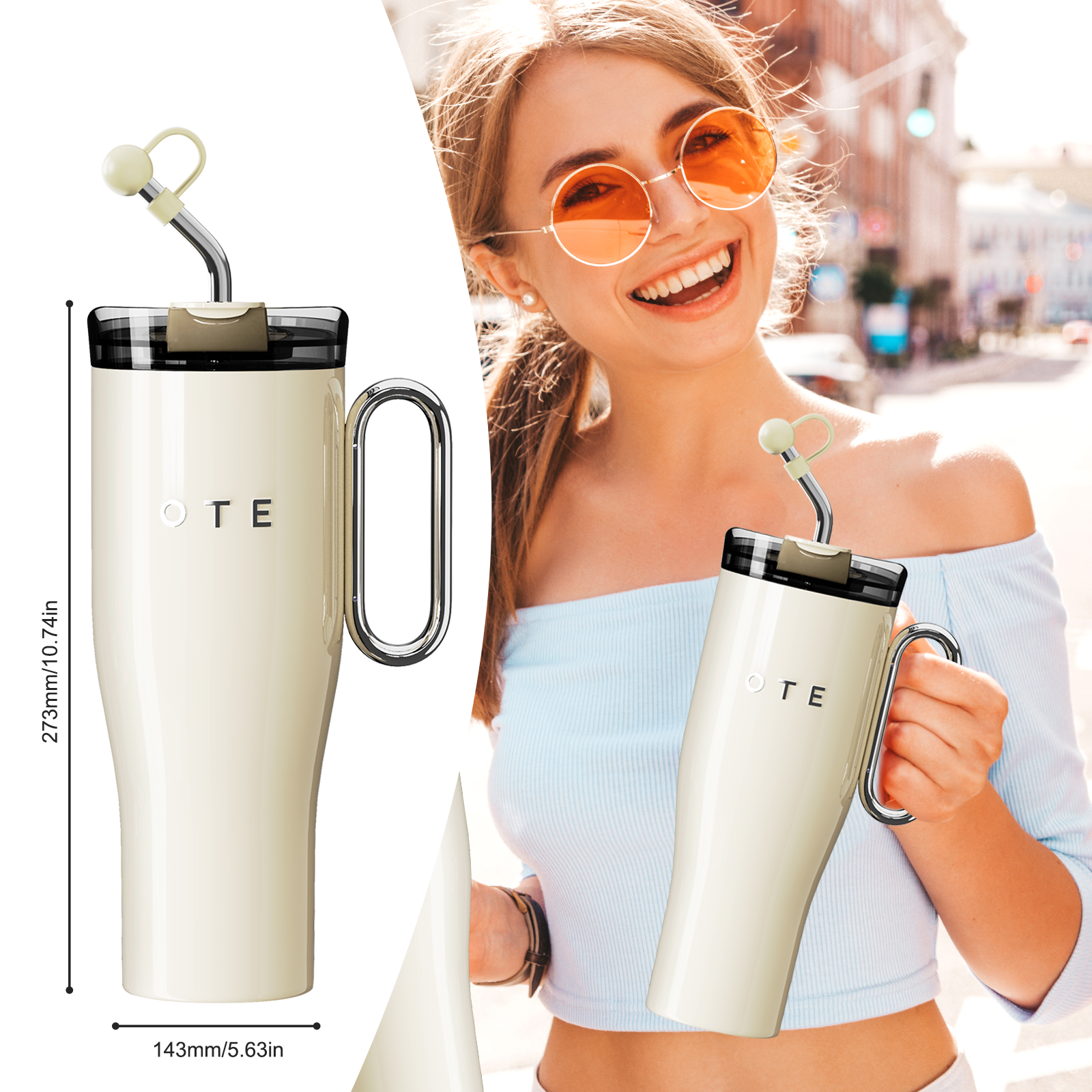 OTE 1. 2 L Tasse de voyage (40 oz) avec poignée, tasse isotherme à double paroi en acier et paille, sans BPA, tasse de voiture portable, tasse thermique, tasse à café pour boissons chaudes et froides